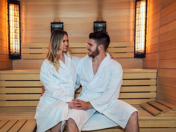 An infrared sauna with Himalayan salt rocks combines deep-penetrating infrared heat therapy with the benefits of halotherapy (salt therapy), which proponents claim enhances detoxification, improves respiratory health, and promotes relaxation. The combination creates a unique, spa-like experience.